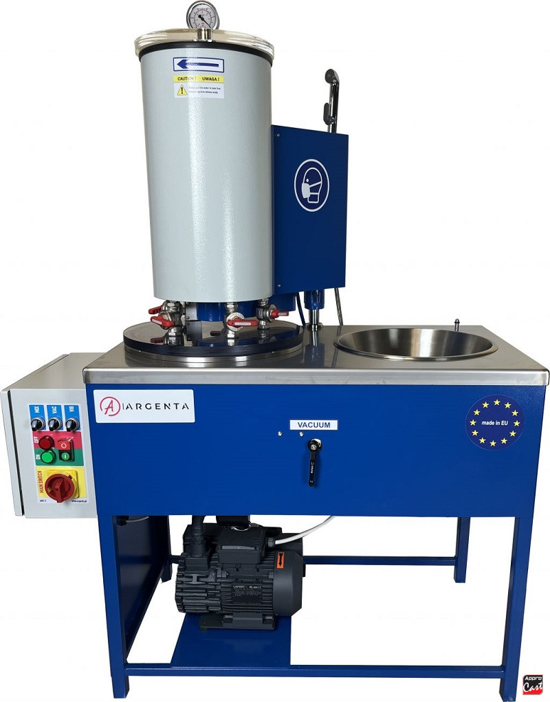 L'appareil permet à l'utilisateur de mélanger la poudre de revêtement et de la verser dans cinq flacons simultanément dans une atmosphère sous vide. Le remplissage simultané de tous les flacons, et non « l'un après l'autre », raccourcit de manière optimale le processus lui-même et fait en sorte que chaque flacon soit rempli immédiatement après le temps de mélange recommandé par le fabricant de poudre. La pompe à vide et le vibrateur intégré permettent un dégazage précis de la poudre de coulée mélangée, ce qui affecte considérablement la qualité des produits de fonderie. Le mécanisme du mélangeur est construit sur la base d'une transmission parallèle mécanique et il est alimenté par un inverseur vectoriel qui vous permet de contrôler la vitesse du processus de mélange. La conception de l'appareil permet un nettoyage rapide de la chambre de mélange, sans qu'il soit nécessaire de démonter les composants de l'ensemble du mélangeur. Les vannes de fonctionnement ont une conception d'étanchéité spéciale résistante aux effets nocifs des composés contenus dans la poudre. De plus, si vous devez nettoyer la vanne, vous n'avez pas besoin de la dévisser et de la retirer de l'appareil.